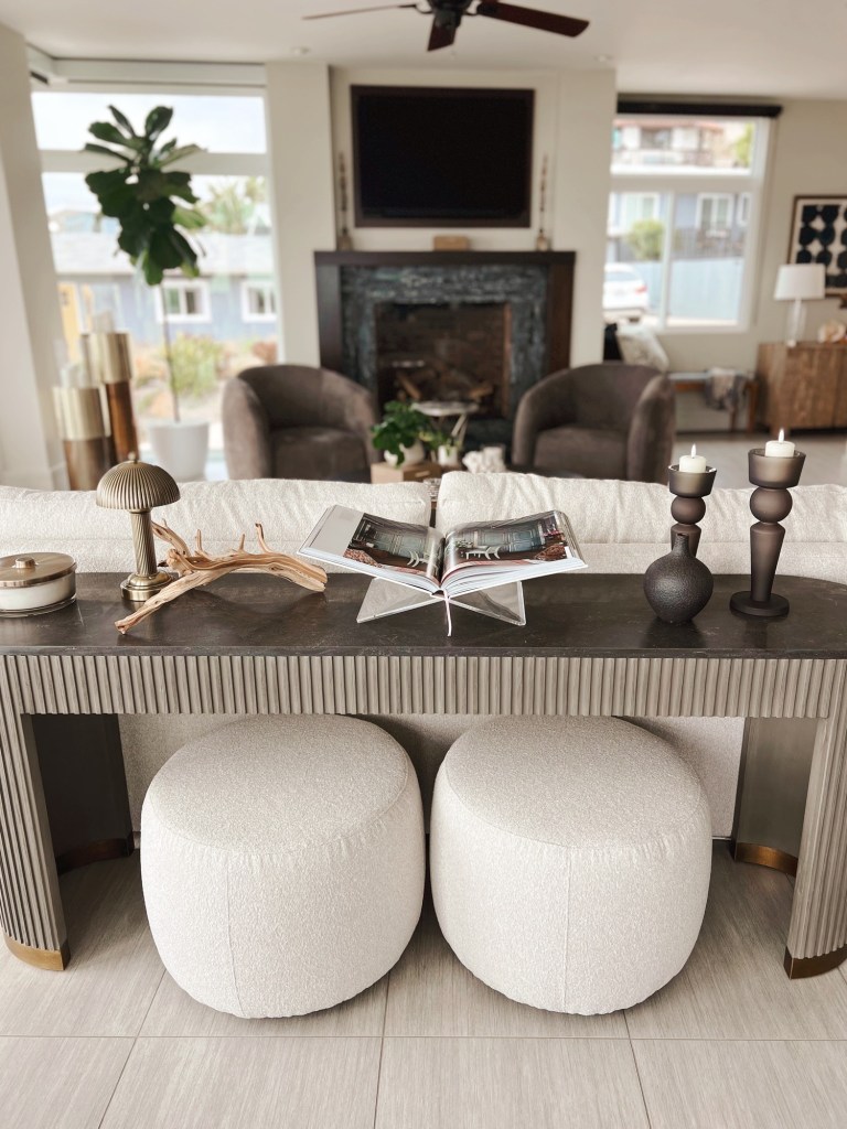 This rule was a little trickier for me because I really wanted this home to have a more formal style – one I’ve dubbed “modern coastal luxe”. It was tempting to choose style over function and comfort, but I think we managed to achieve both. We chose a deep cozy sofa and two barrel chairs. The sofa is covered in a fine boucle and and the barrel chairs are a soft gray suede. We liked the contrast in the look and feel of the textures.