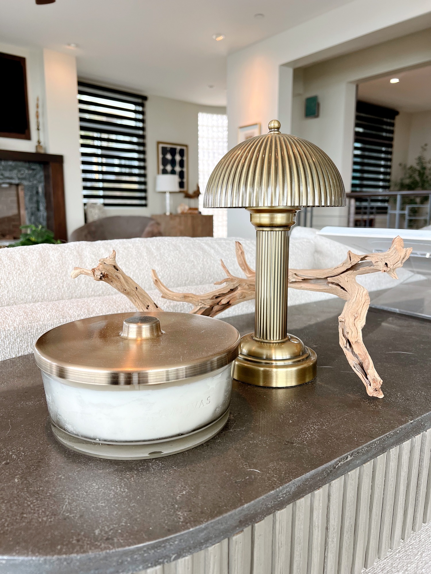 Candles are another way to add soft lighting to a space. These large gold metal floor candle holders from Arhaus were a splurge and I absolutely love them. The candles turn on and off automatically on a timer and cast a lovely glow in the evenings. They up the glam factor in the room for sure!