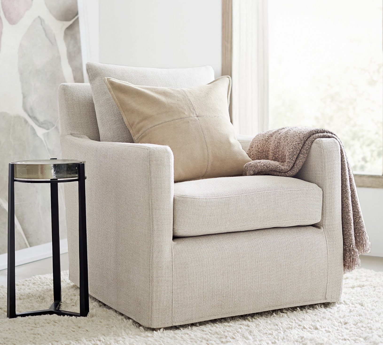 I’m thinking about layering a rug on top of the one we have in our family room. A thicker, textured rug on top of the flat rug in our would create a warm, layered look. In the example from Pottery Barn below, a neutral sisal rug is topped with a smaller flat-weave terracotta rug, adding a colorful layer to the floor and upping the cozy factor.