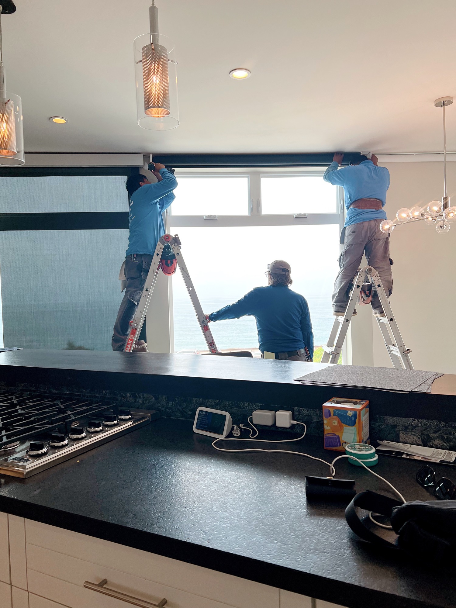 While we were in San Diego, we arranged to have the window coverings on all of our ocean-facing windows changed out. The existing black ones provided us some sun protection in the afternoons, but because they were made of a mesh material, at night we felt like were living in a fish bowl. So, we swapped them out for opaque shades that match the existing wall color.