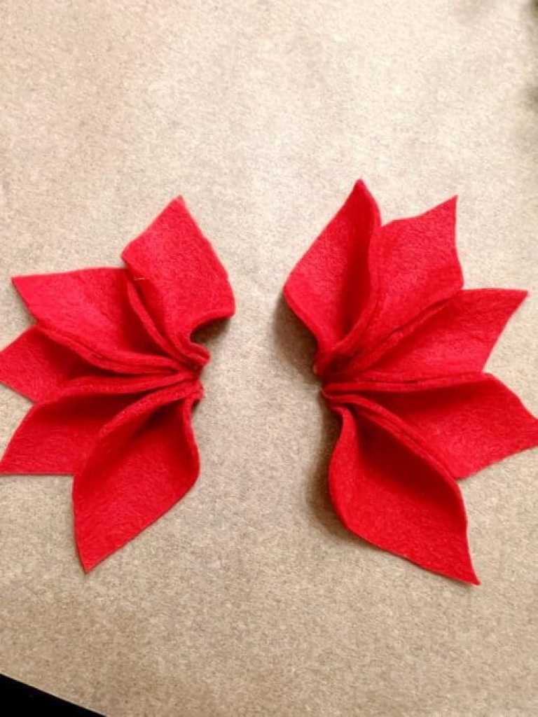 Through trial and error I found the best way to put the flowers together is one half at a time. To start, I placed a drop of glue on the round end of each leaf and pinched it together until it held. I did this for all of the leaves, both red and green.