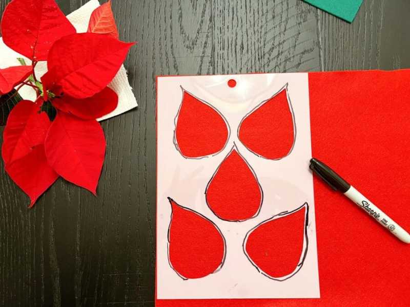 Once you’ve created your stencil, use your Sharpie to trace leaf shapes on your felt. I used 10 red and 10 green leaf cutouts per flower (the extra green leaves were made into holly “filler”.) I repeated this entire process 6 times for a total of 120 leaves. Set aside your larger scraps for later.