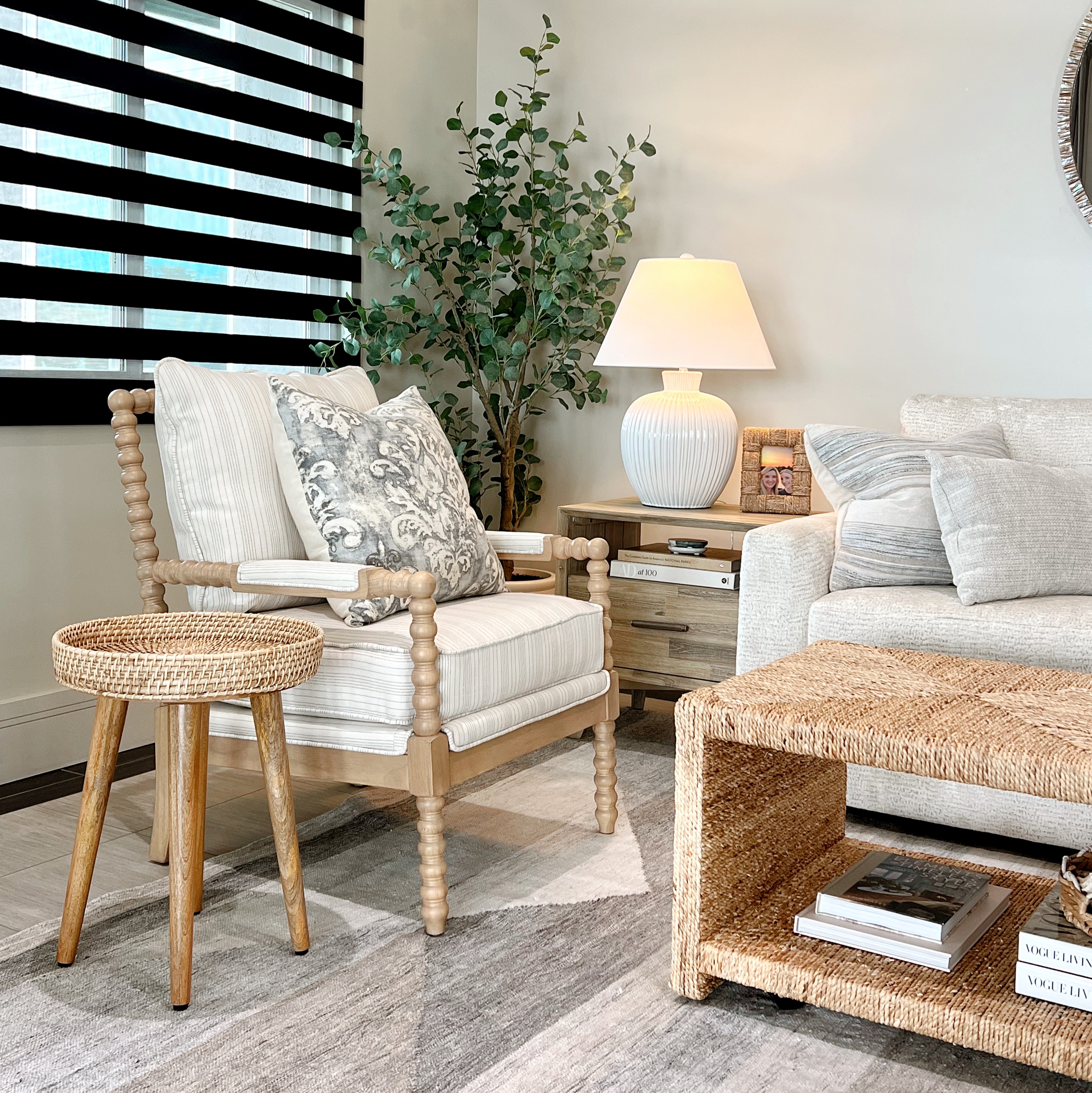 The latest addition to our home is this pretty spindle chair. I’ve been looking for a chair for our office/guest room for a while and happened upon this at HomeGoods. The pale wood and neutral upholstery complement the other beachy tones in the room. Plus it’s comfy to sit on.